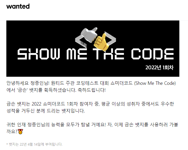 4월 2일 : 원티드 주관 쇼미더코드 금손 뱃지 획득 (올솔브, 50분) - https://www.acmicpc.net/category/detail/3097