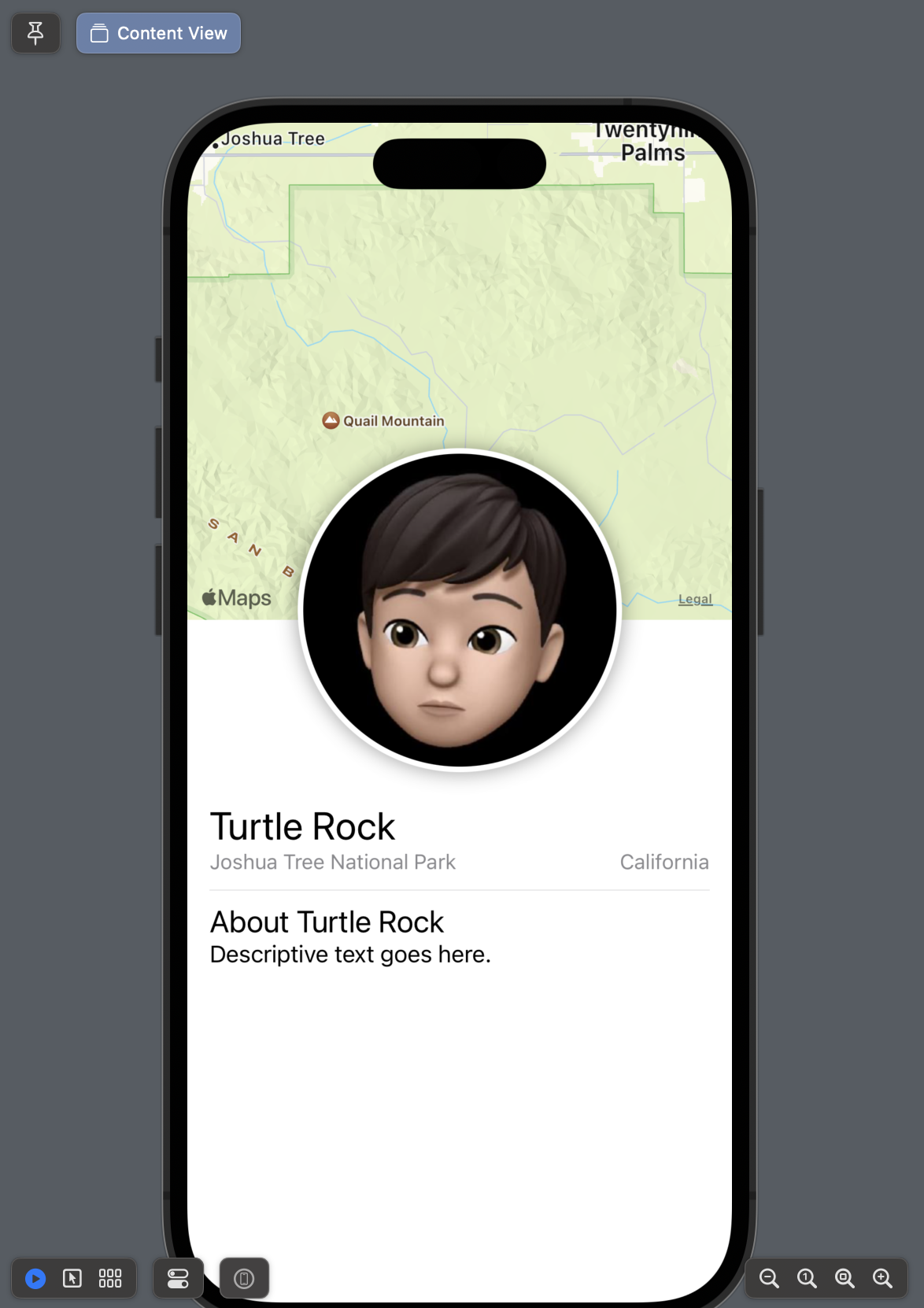 import SwiftUI import MapKit struct MapView: View { @State private var region = MKCoordinateRegion( center: CLLocationCoordinate2D(latitude: 34.011_286, longitude: -116.166_868), span: MKCoordinateSpan(latitudeDelta: 0.2, longitudeDelta: 0.2) ) var body: some View { Map(coordinateRegion: $region) } } struct MapView_Previews: PreviewProvider { static var previews: some View { MapView() } }Section 6. Compose the Detail View