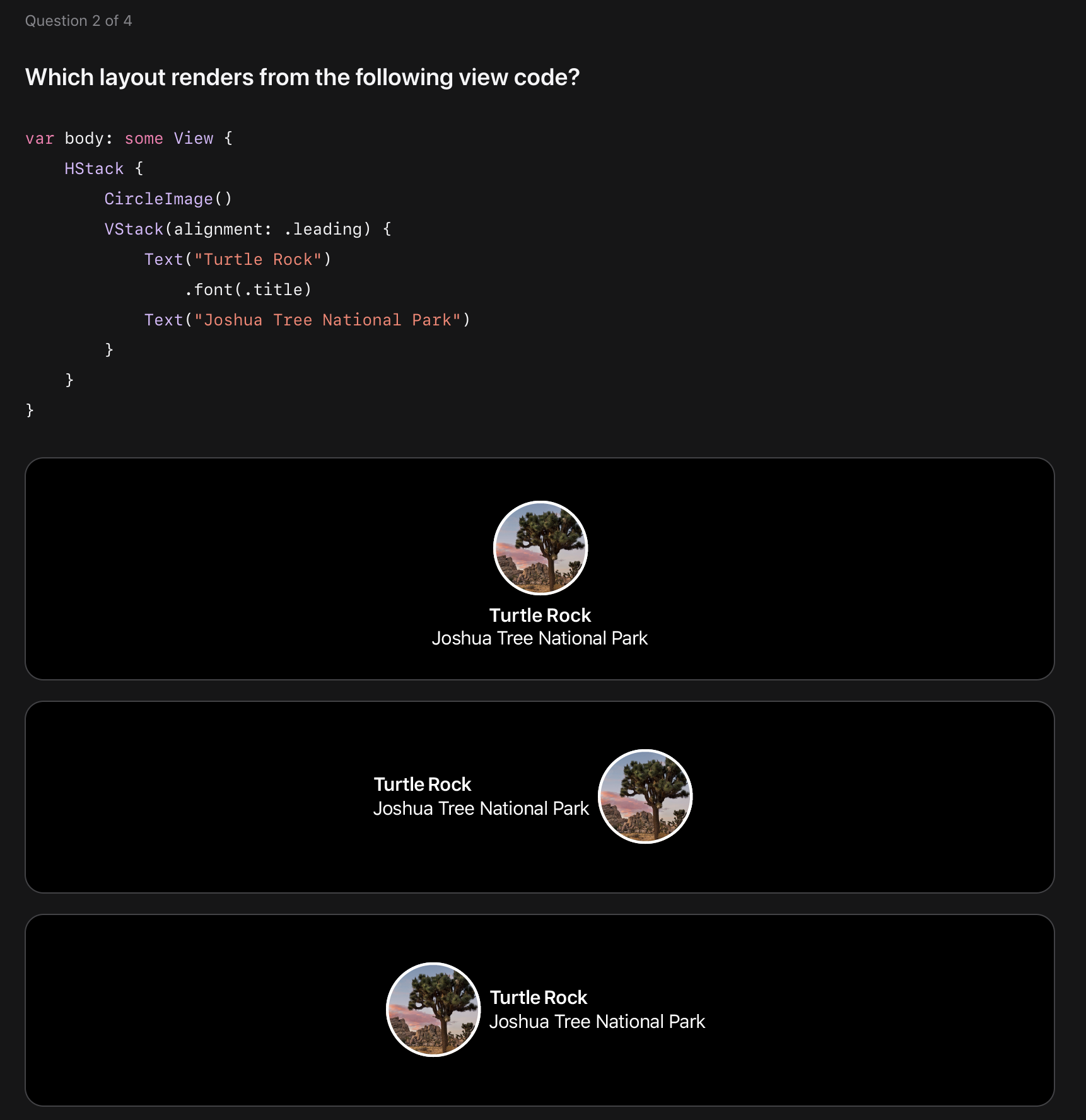 import SwiftUI struct ContentView: View { var body: some View { Text("Turtle Rock") .font(.title) } } struct ContentView_Previews: PreviewProvider { static var previews: some View { ContentView() } }Section 3. Combine Views Using Stacks