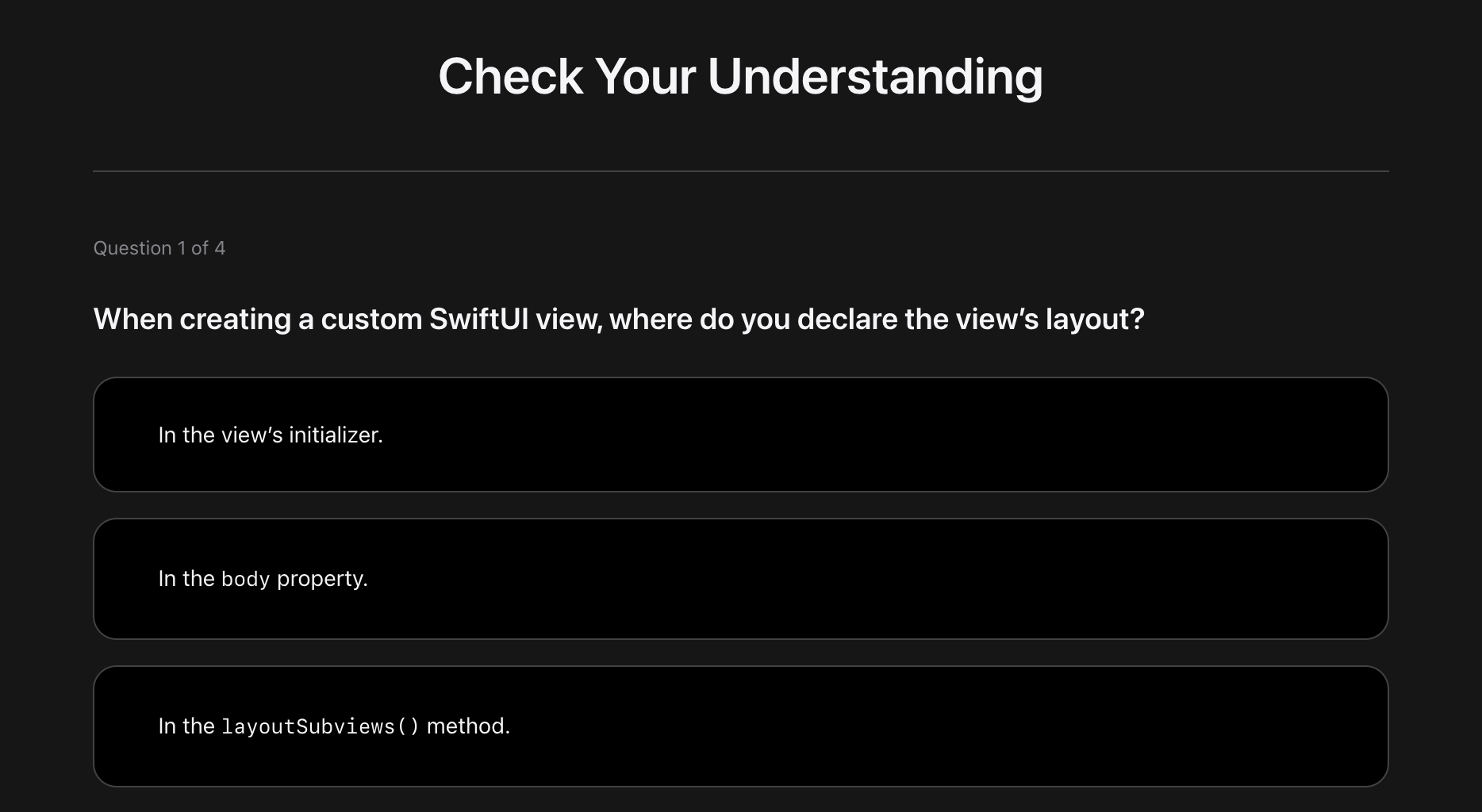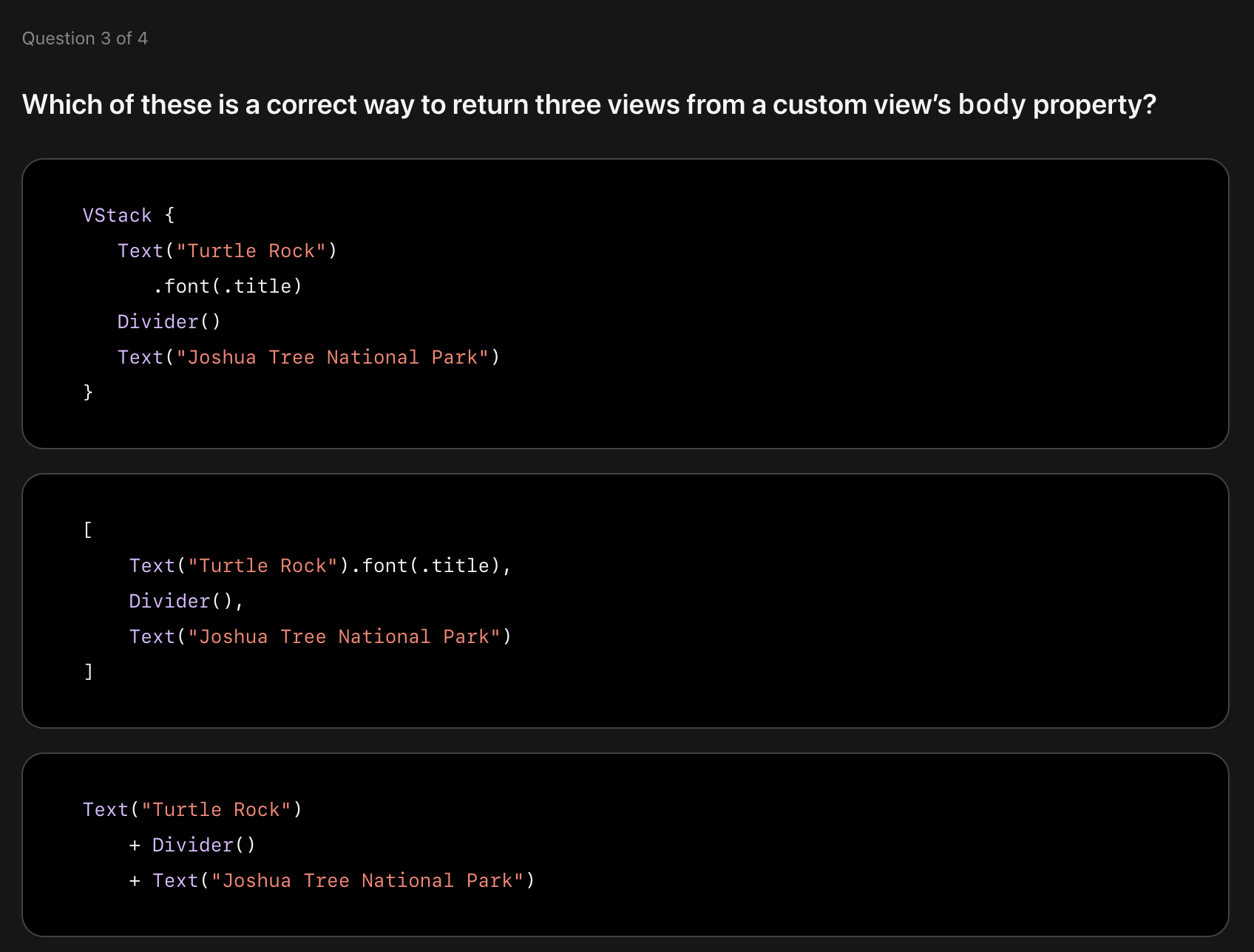 좀 더 복잡하게 쓰면 다음과 같은 코드가 된다.struct ContentView: View { var body: some View { VStack(content: { Text("Turtle Rock") .font(.title) HStack { Text("Joshua Tree National Park") .font(.subheadline) Spacer() Text("California") .font(.subheadline) } }) .padding() } }그냥 맘 편하게 생략하도록 하자.