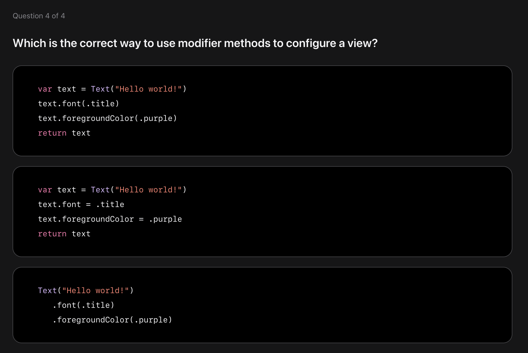 struct ContentView: View { var body: some View { return Text("Hello, world!") .padding() } }하지만 return문 없이 다음과 같이 작성하면?